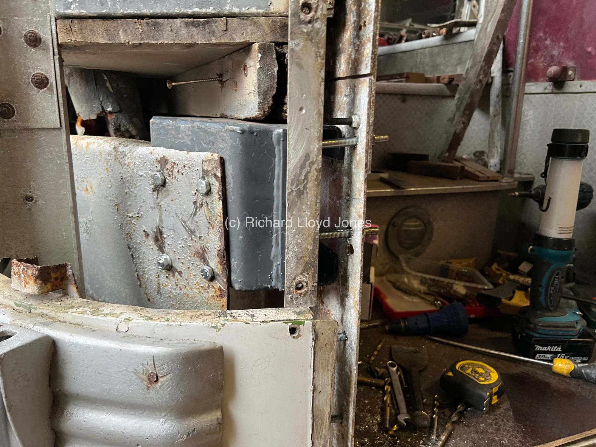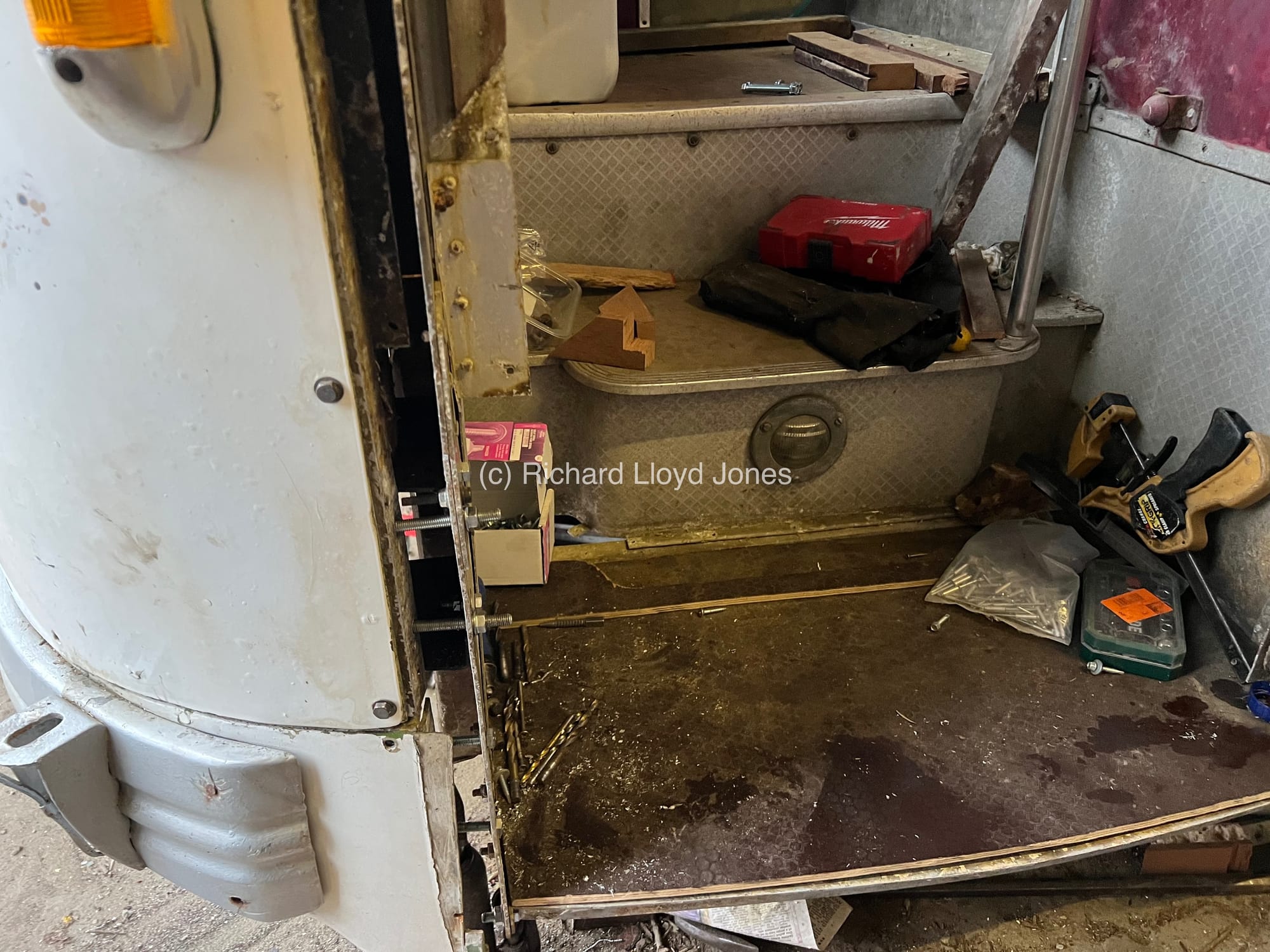 The front cowl and lower body section under this now fits perfectly. Next time a new vertical section will be placed within the gap seen. The vehicle’s entrance step also begins its restoration today, to be progressed during the next session.