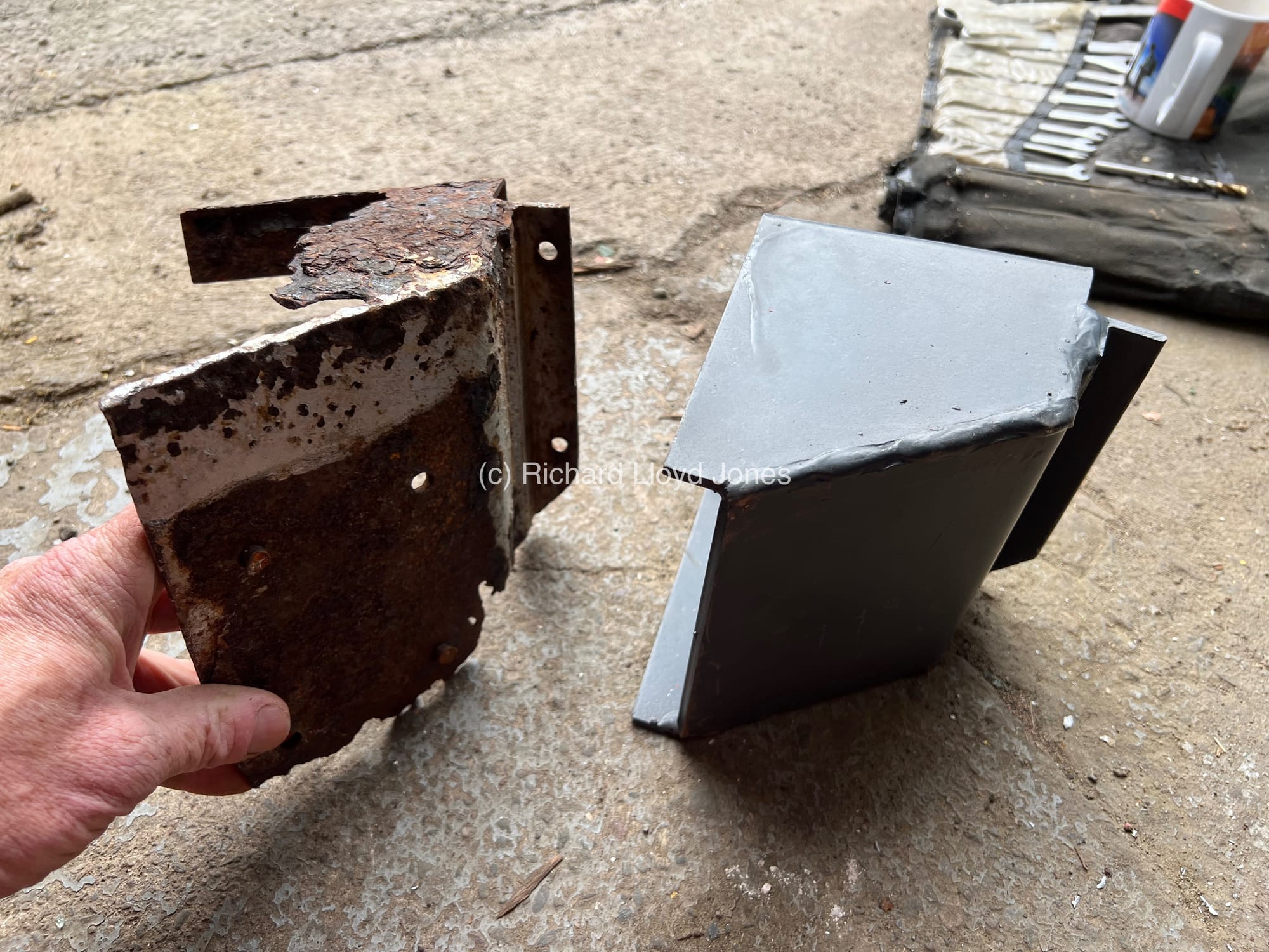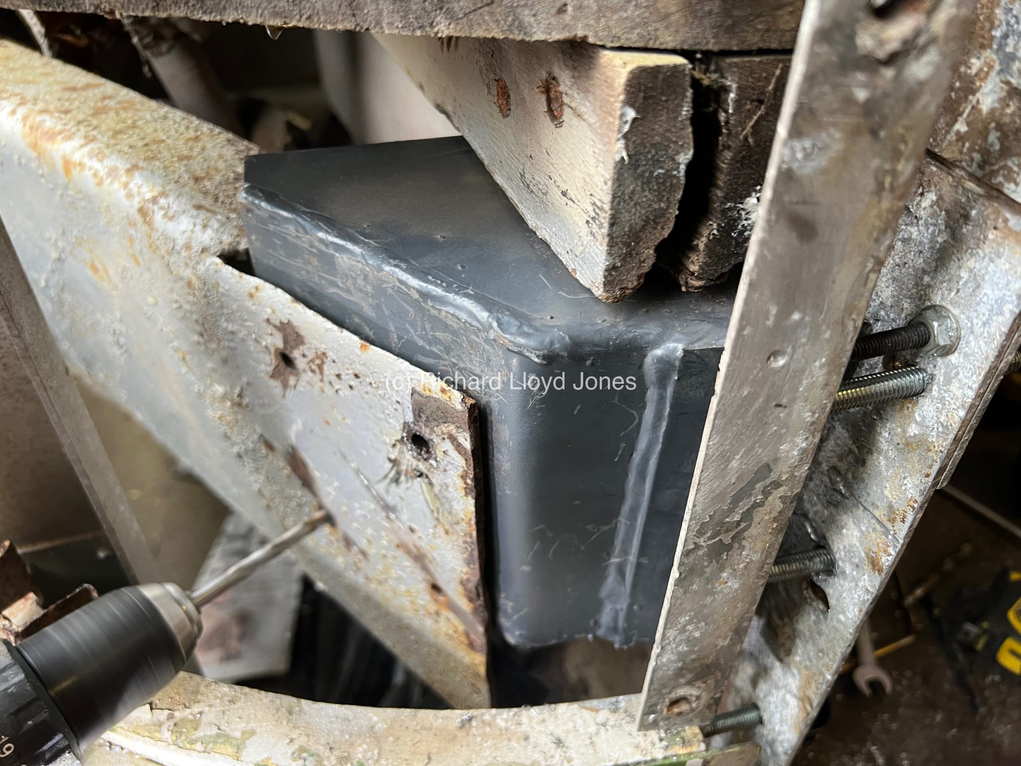 Today as the weather was favourable we decided to fit the new steel section which would be fixed within the nearside front bulkhead section of CRG163. The door of garage in which the vehicle is presently housed for restoration was opened so that natural sunlight could be used to support the work to be undertaken.