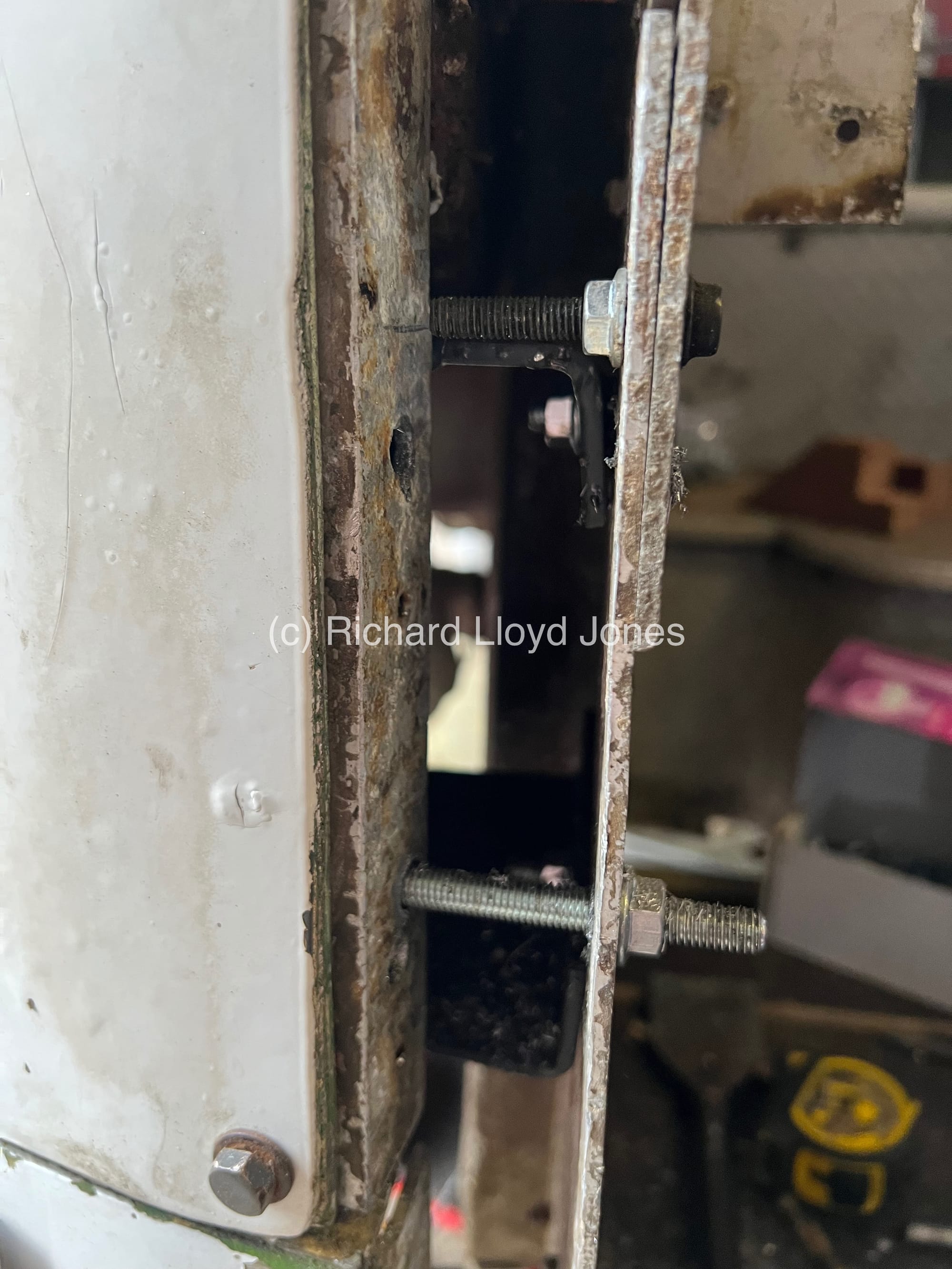 M8 bolts are now inserted to join various panels including the fixing points for the front cowl. A vertical wooden section will be added here next time, replacing the old wood that had deteriorated.