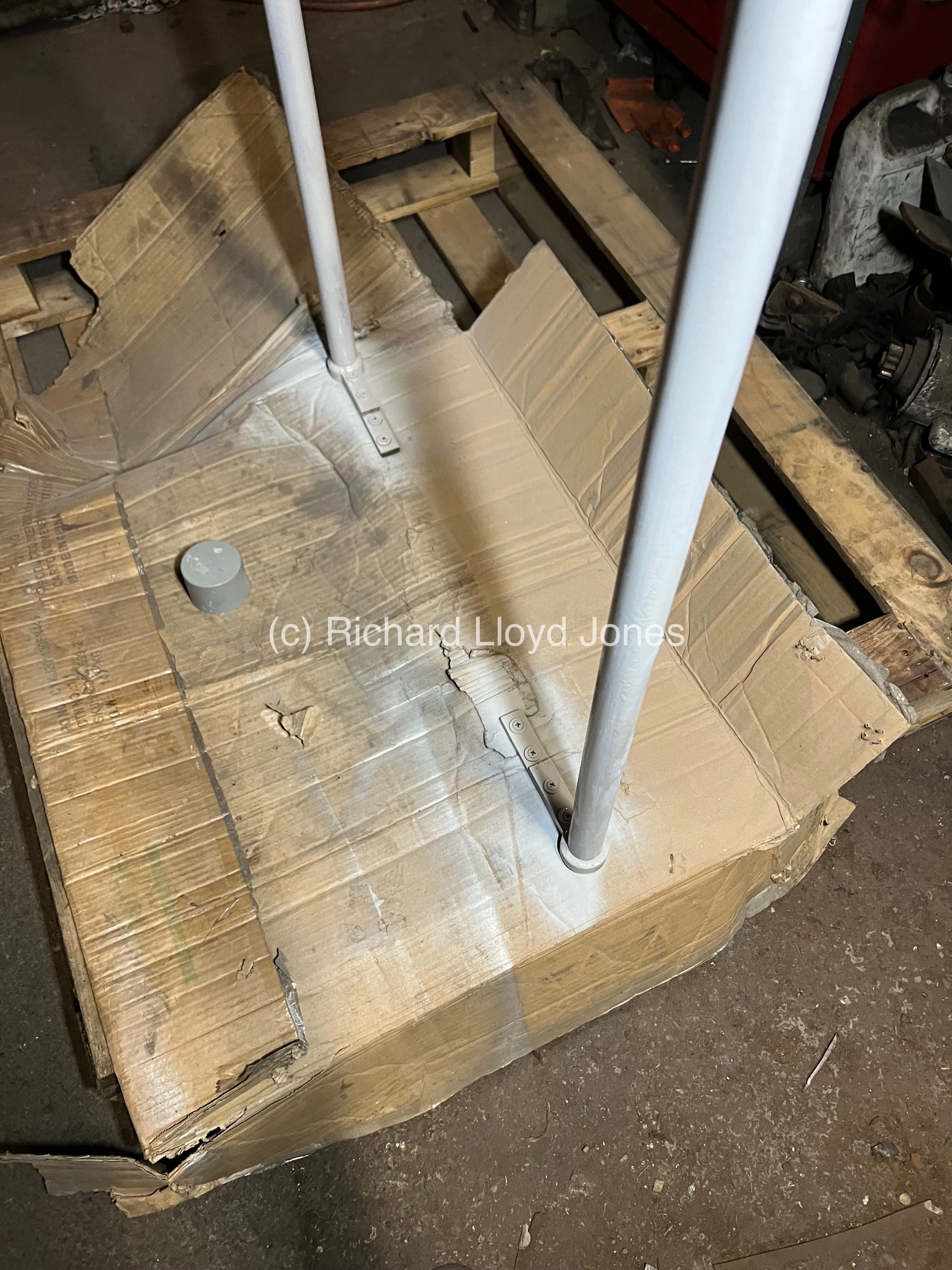 Both entrance door poles are fixed on a crate for ease of spraying as primer is added in preparation for paint.