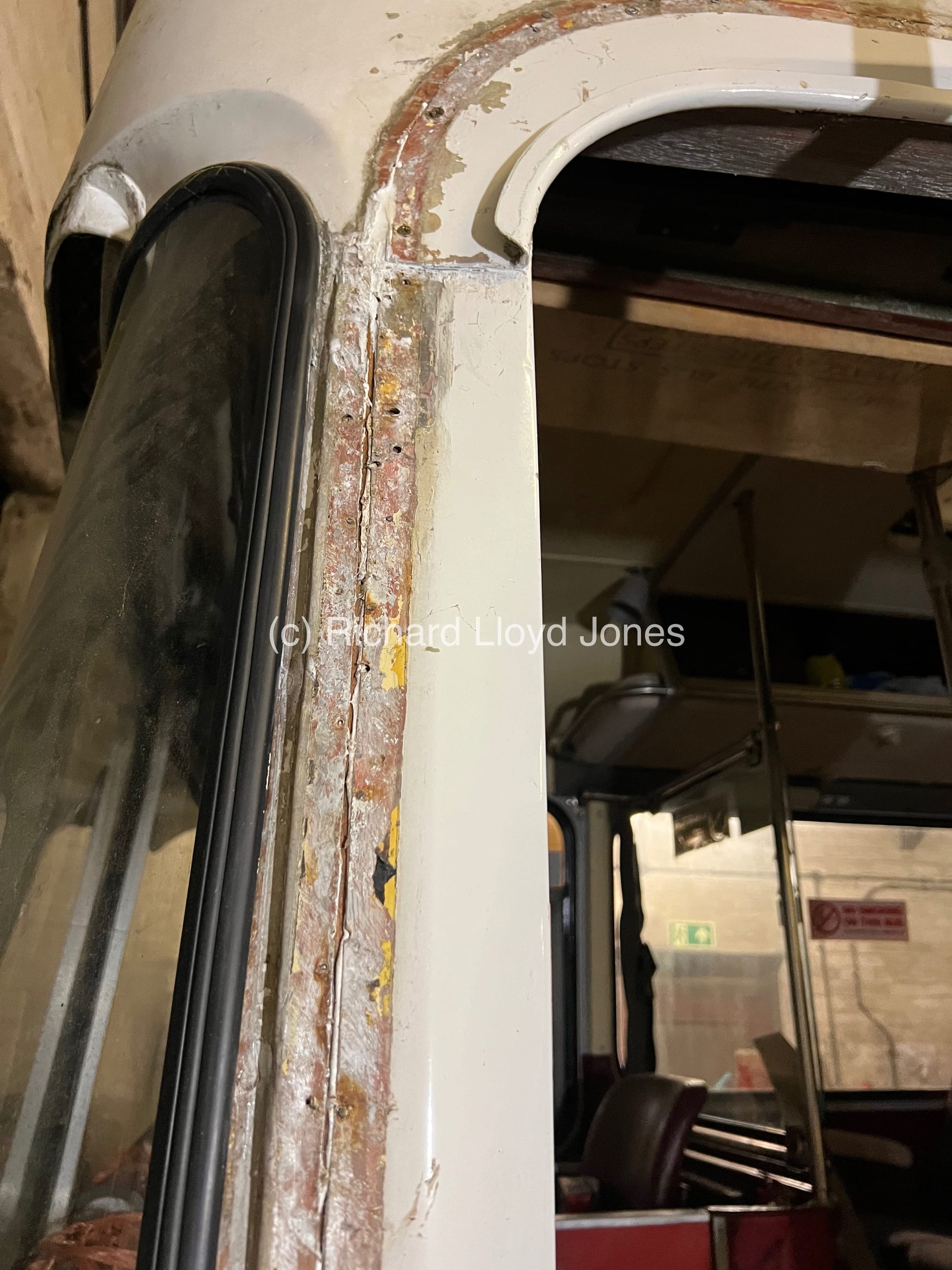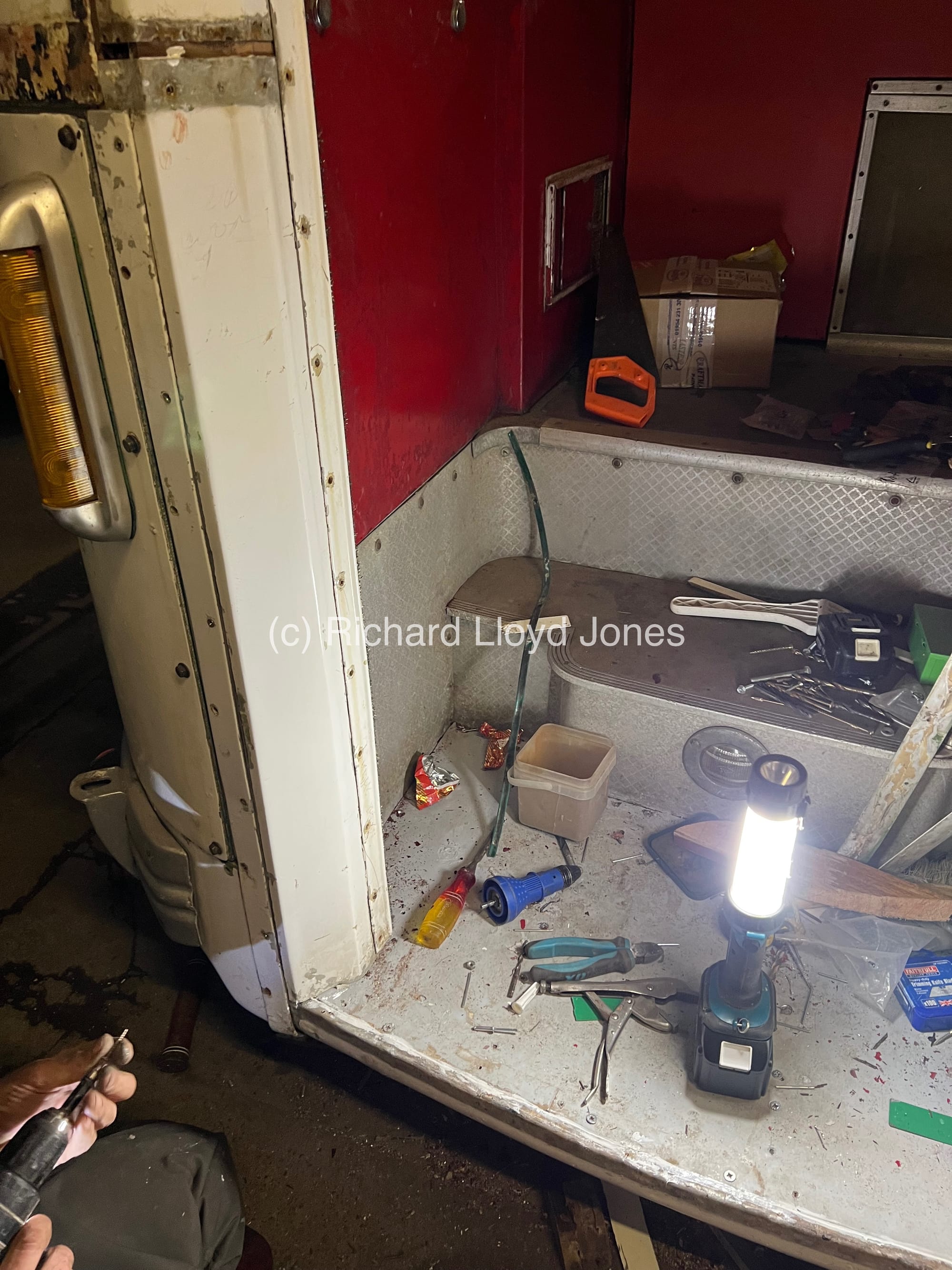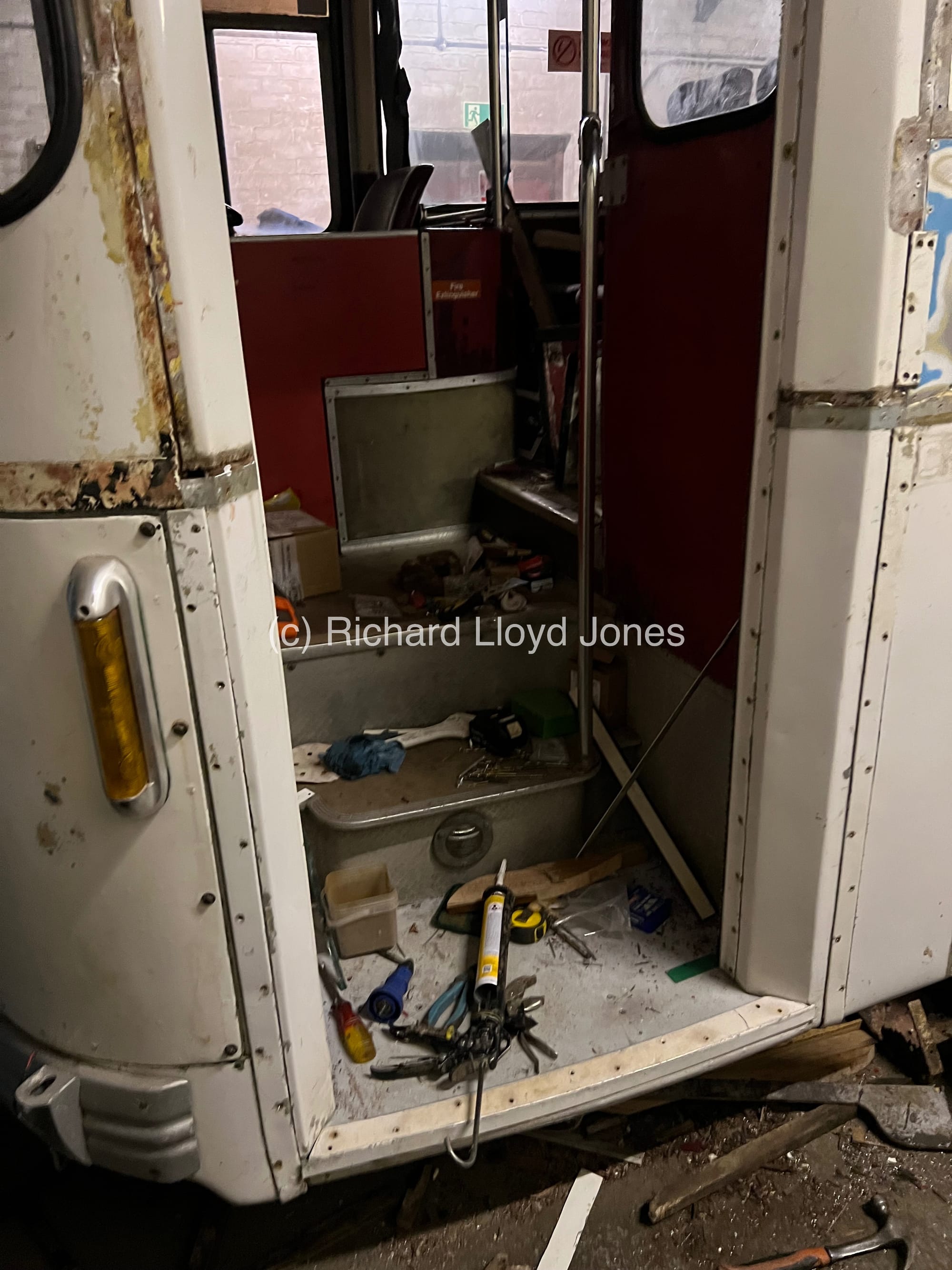 Today we also repair the damaged internal internal vinyl to the left and right of the entrance step and prepare the poles that hold the entrance ‘express’ doors in place.