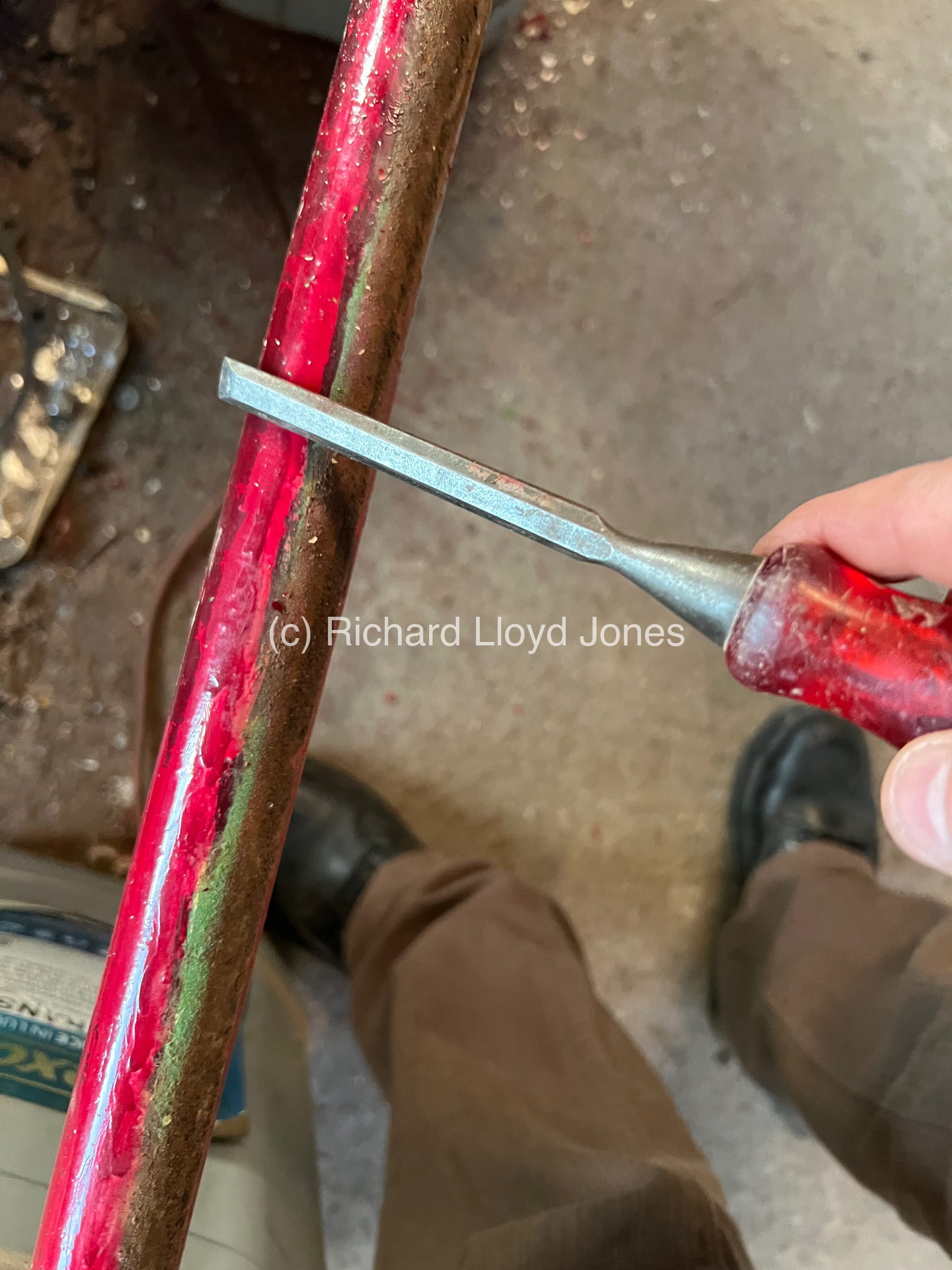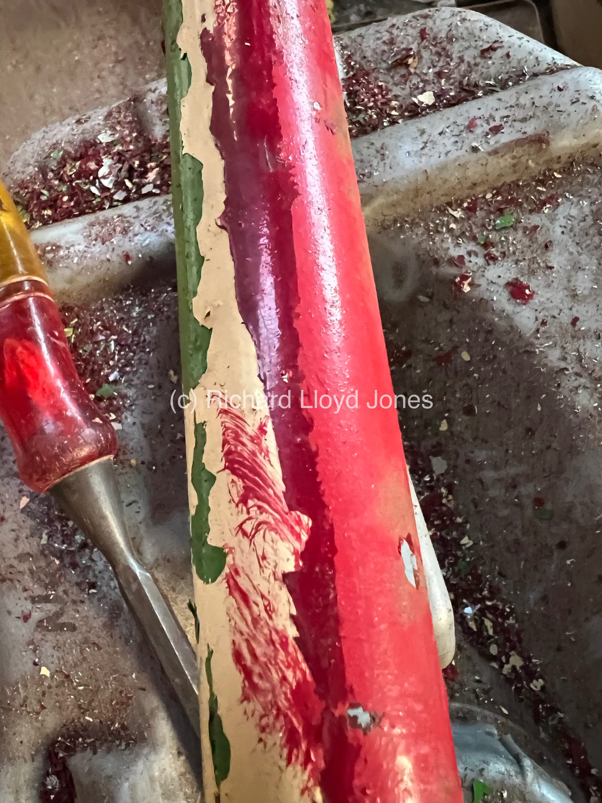 Now onto the second entrance door pole as I repeated the earlier process of carefully removing 55 years of paint with the corner of a small chisel.
