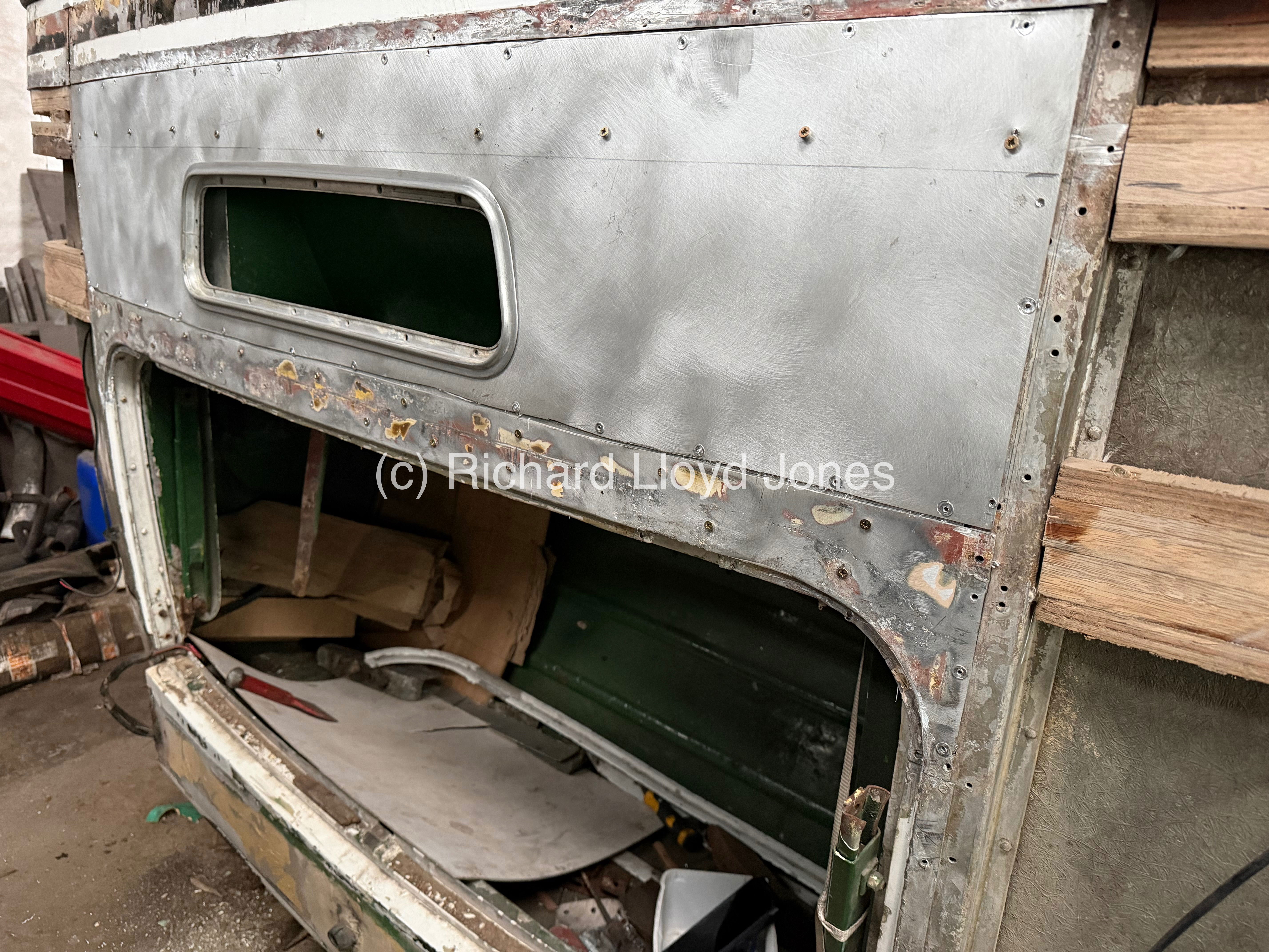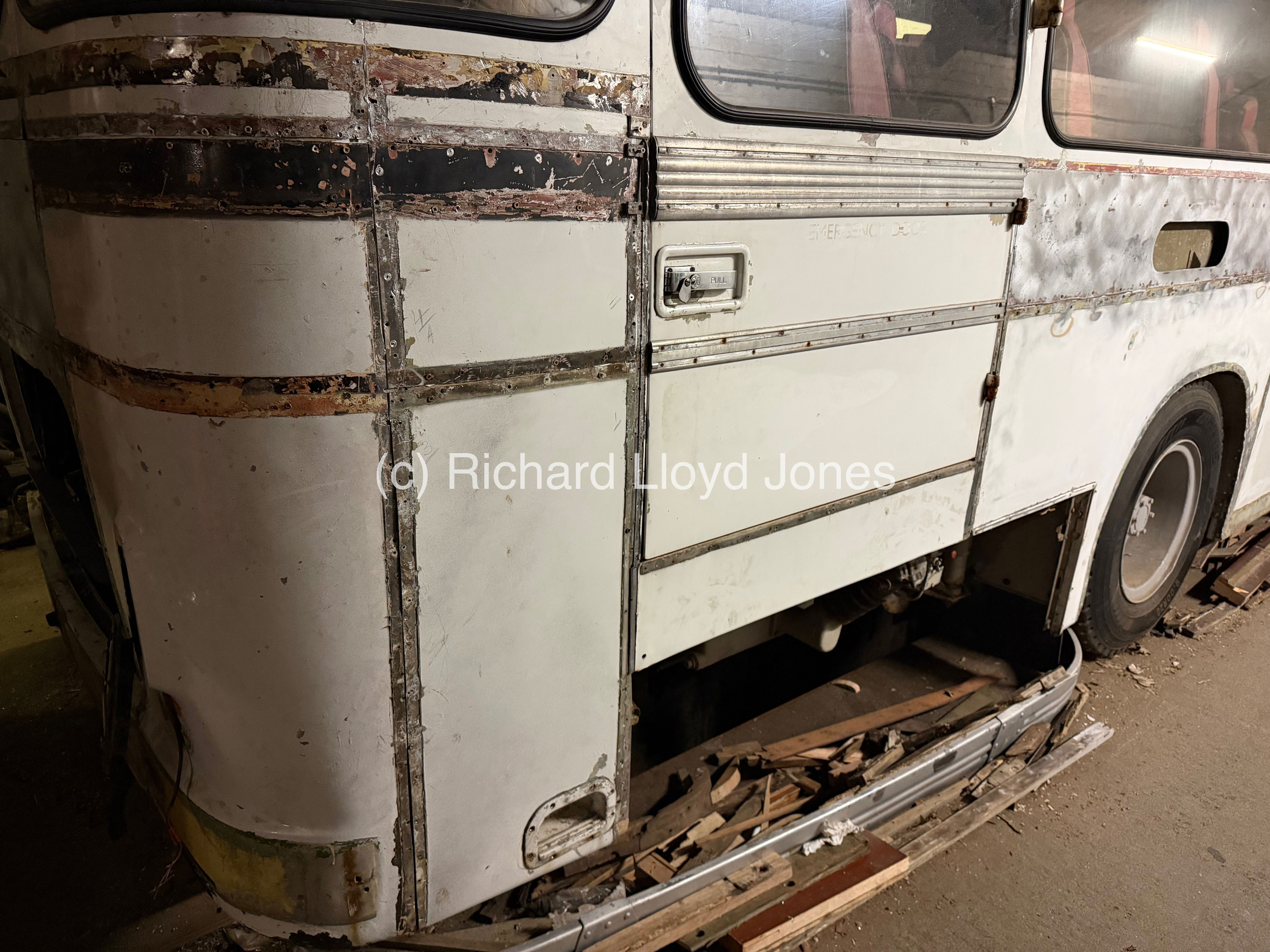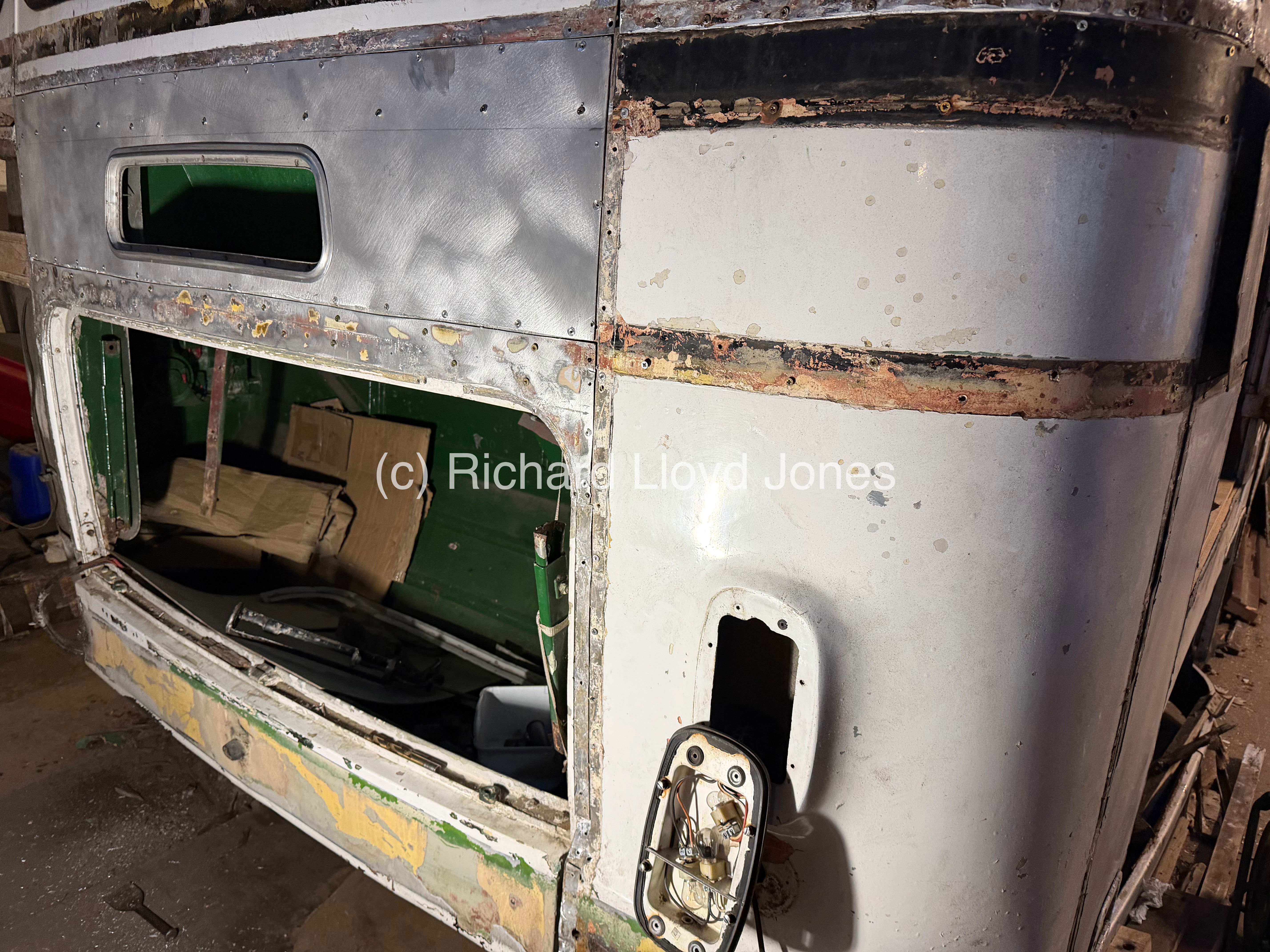A side image of the vehicle’s offside rear section and emergency door. The lower panel that houses the foot step and panel under the emergency door are temporarily in place pending the fitment of the rear and offside rear corner panel first. This is in order to ensure that all panels fit perfectly first having straightened sections underneath from previous accident damage during the vehicle’s operational life.
