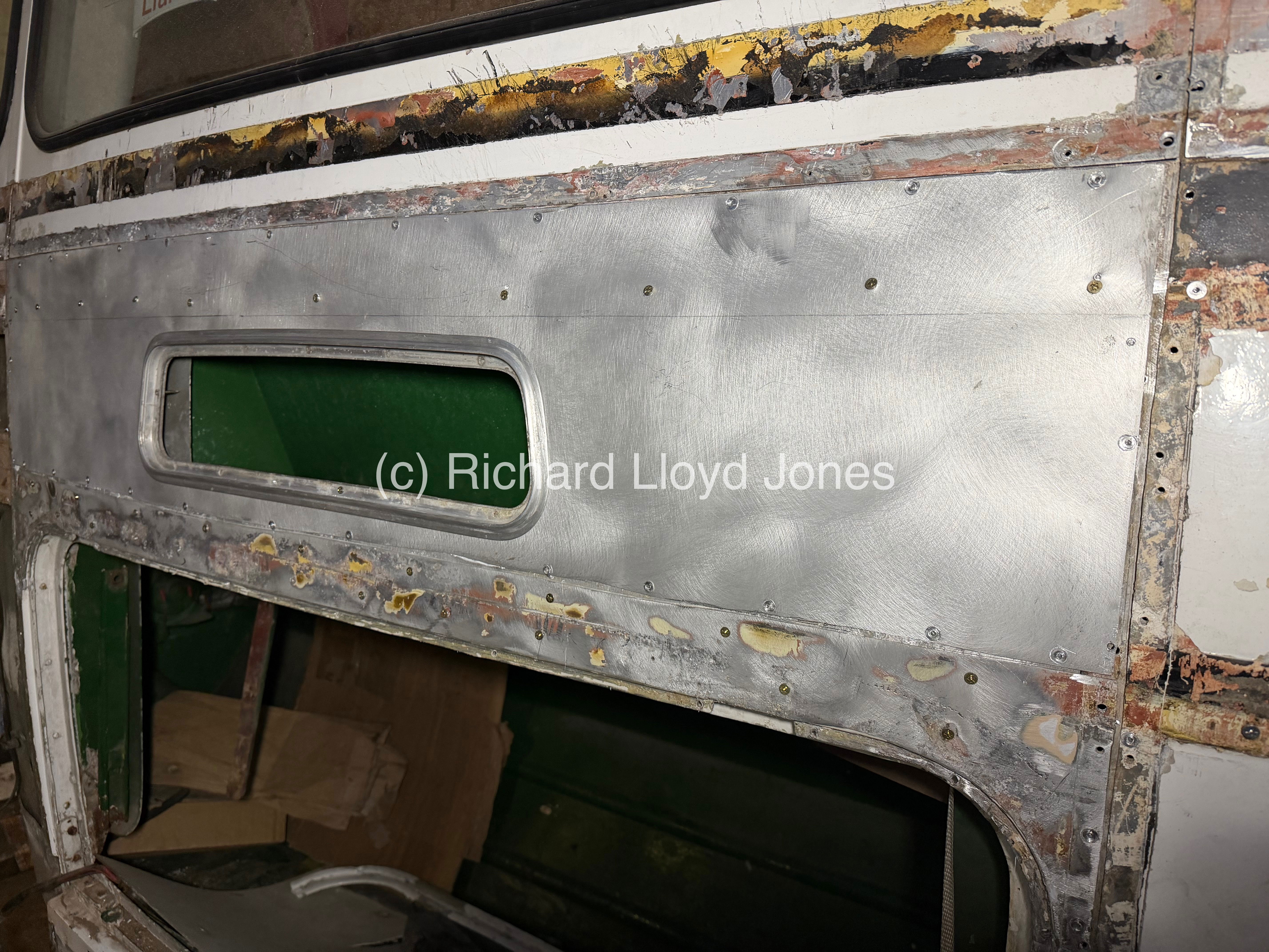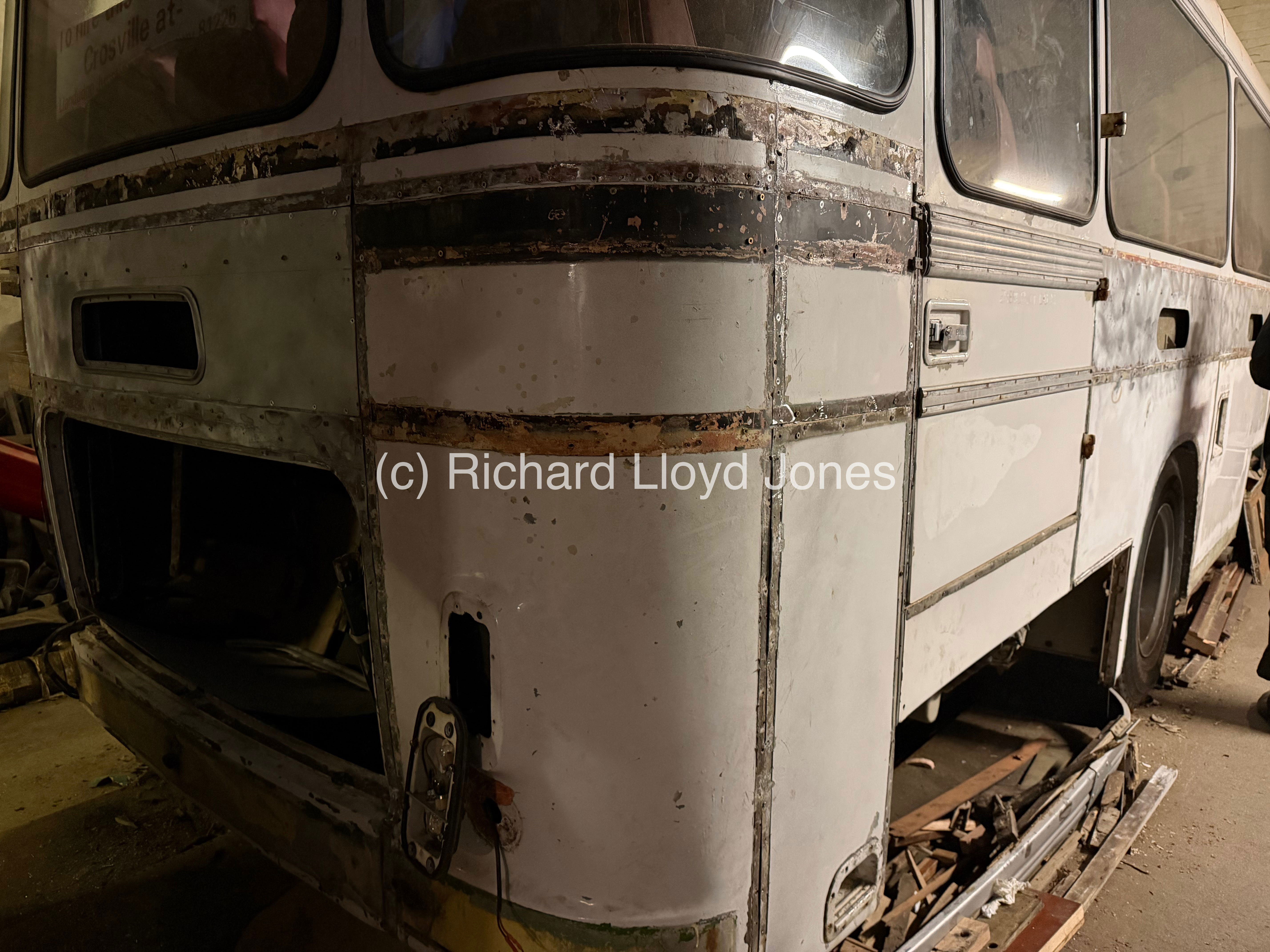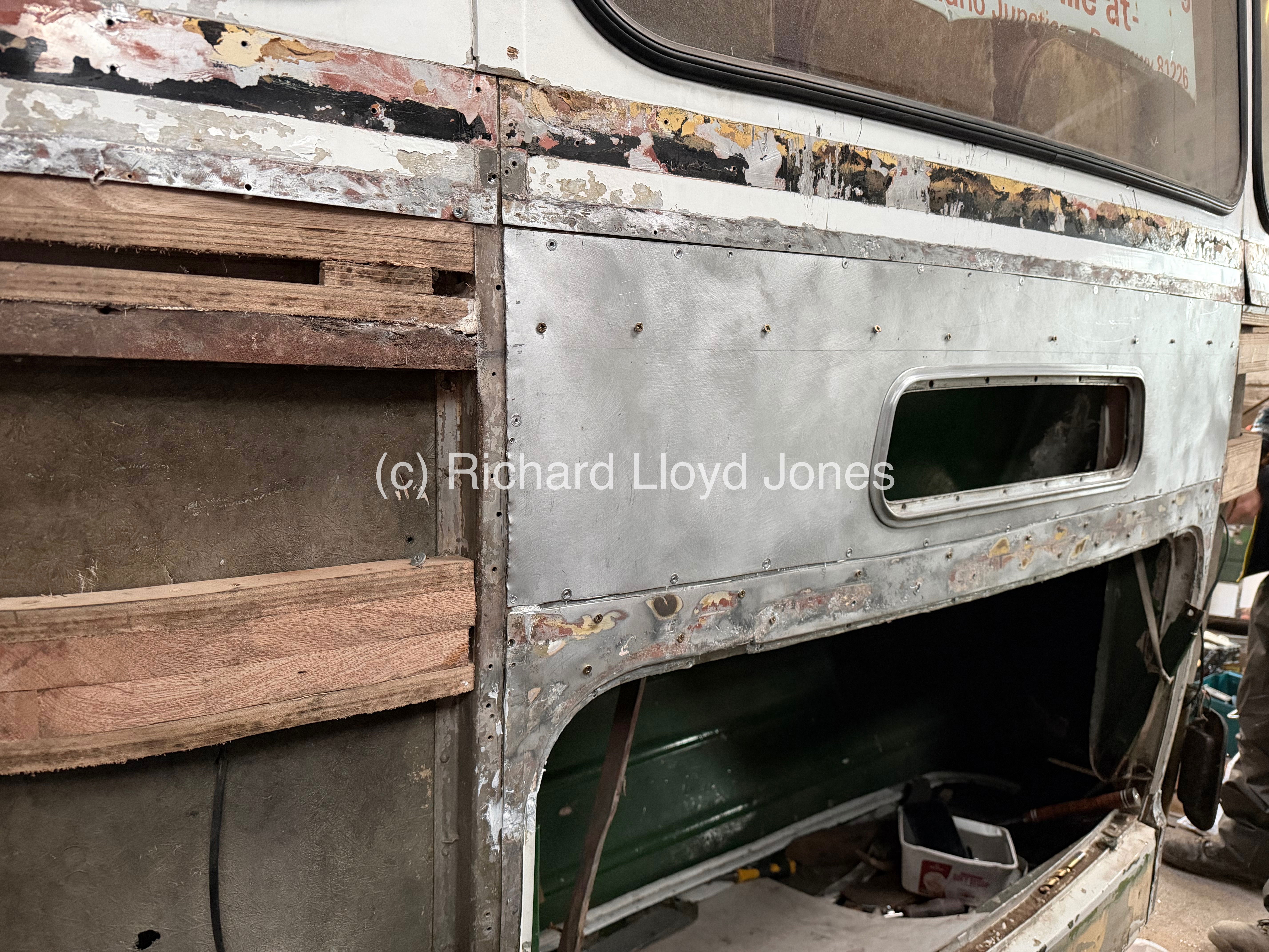 A side image of the vehicle’s offside rear section and emergency door. The lower panel that houses the foot step and panel under the emergency door are temporarily in place pending the fitment of the rear and offside rear corner panel first. This is in order to ensure that all panels fit perfectly first having straightened sections underneath from previous accident damage during the vehicle’s operational life.