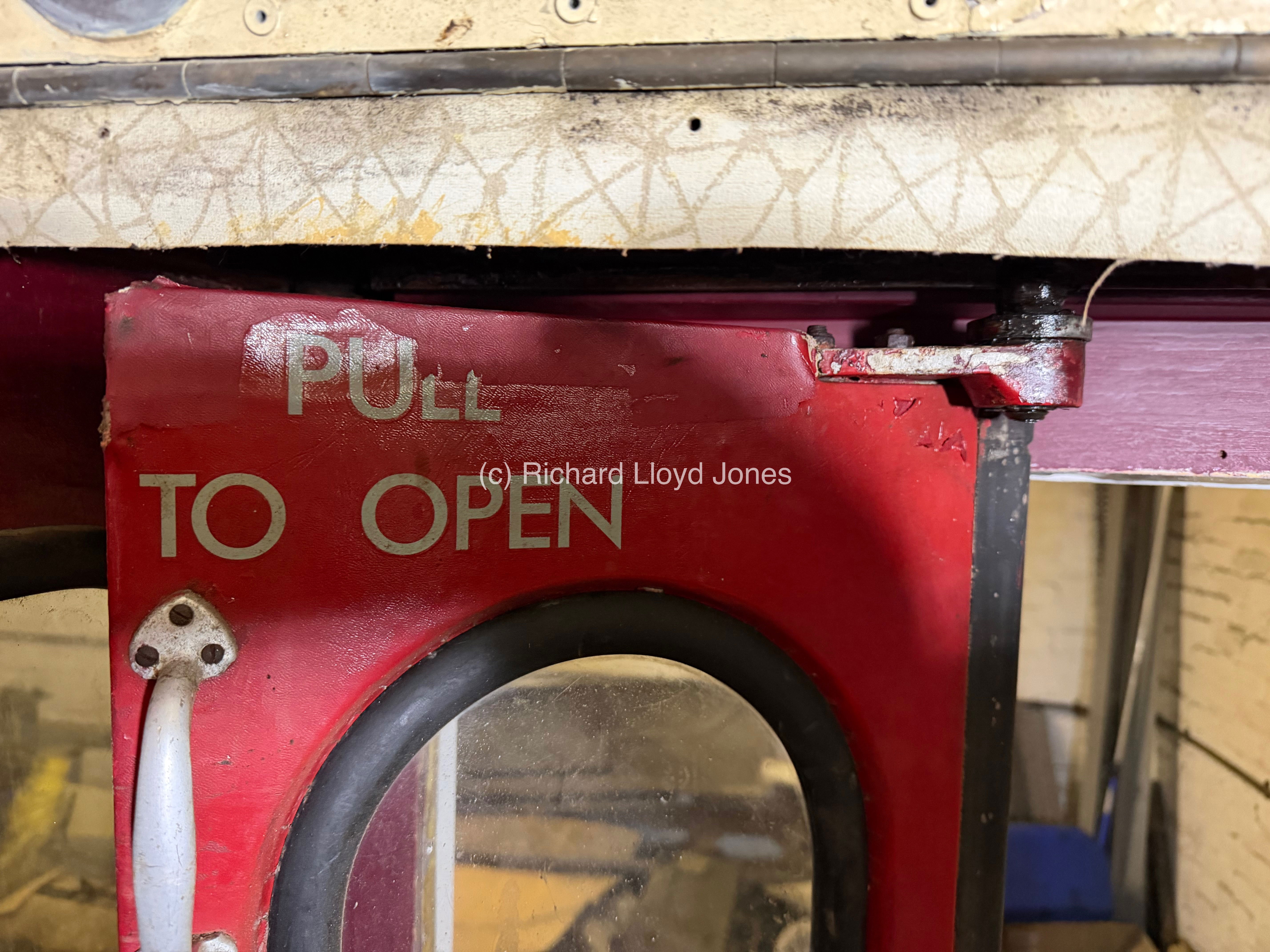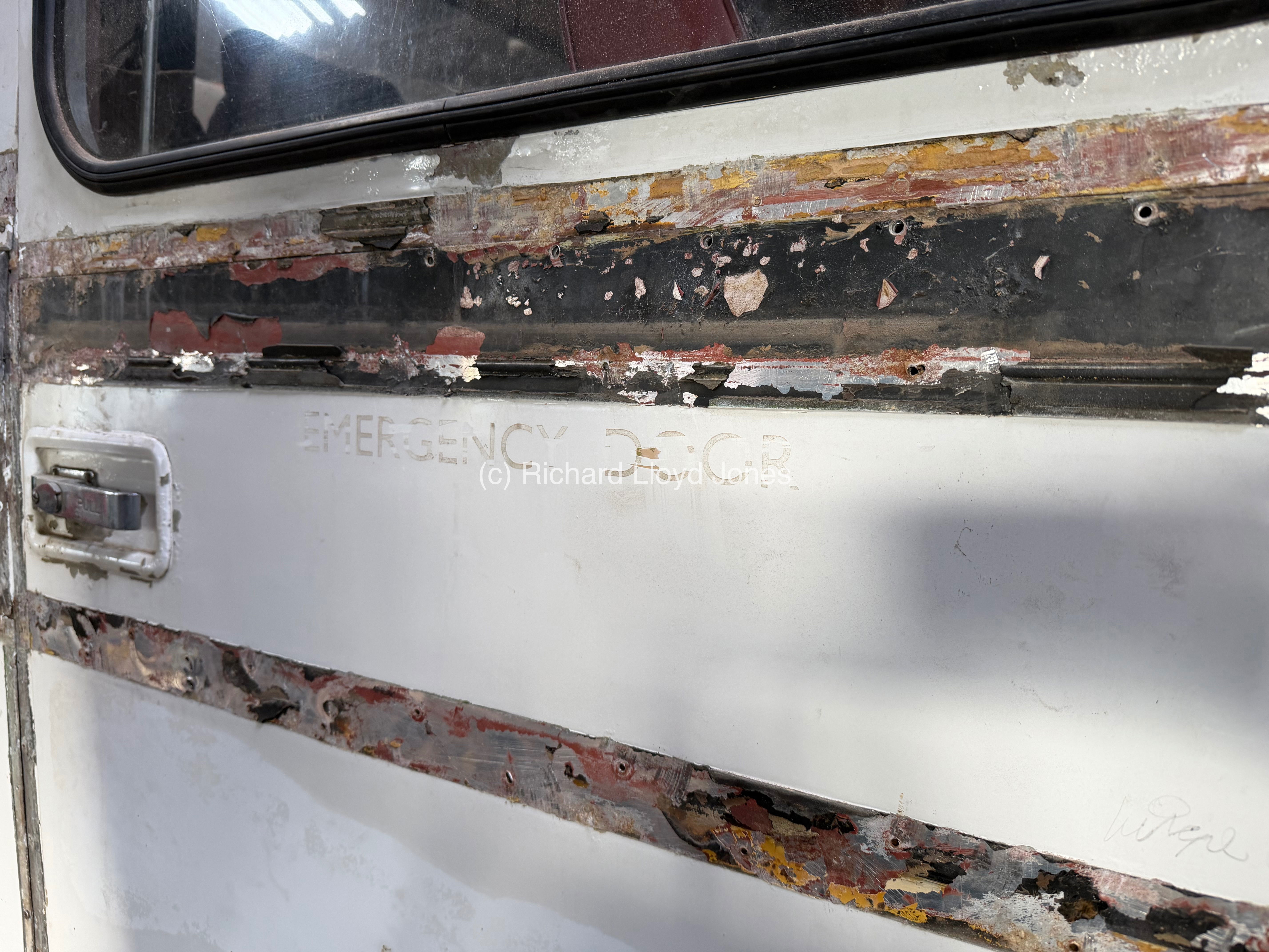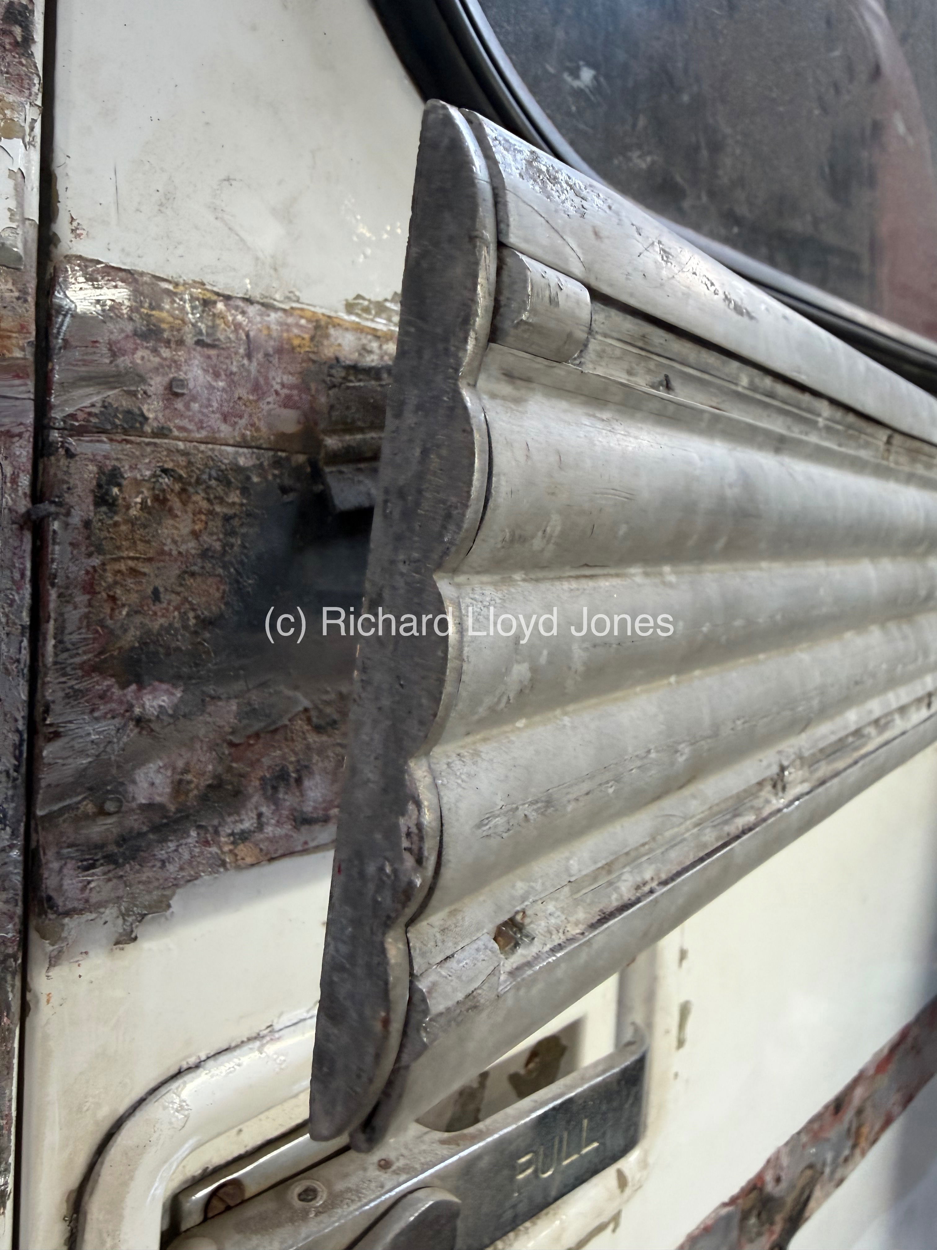 As the passenger door pole brackets and steel washers dry from treatment we turn to removing the final bright work pieces from CRG163 which sits on the offside rear emergency door.