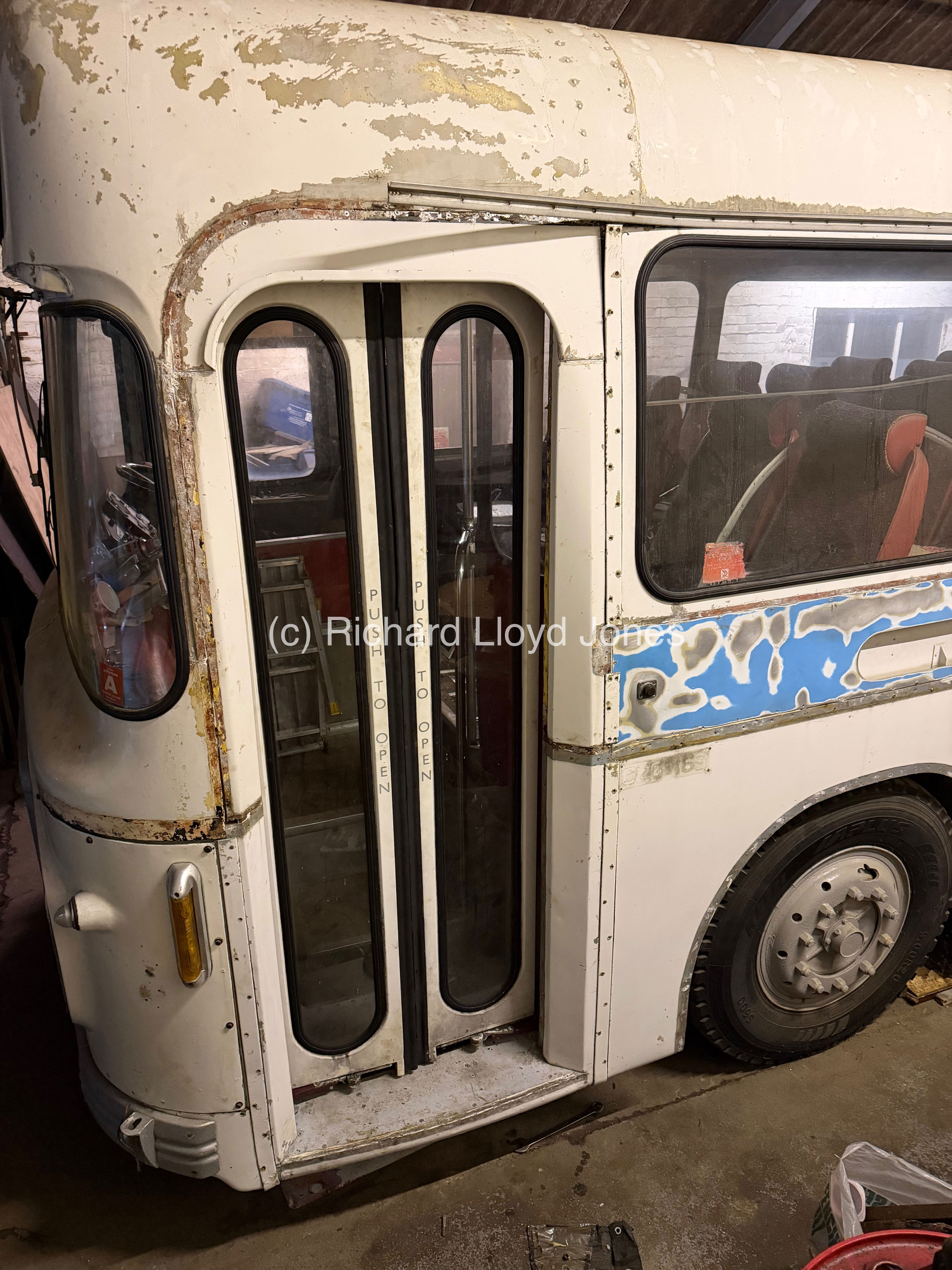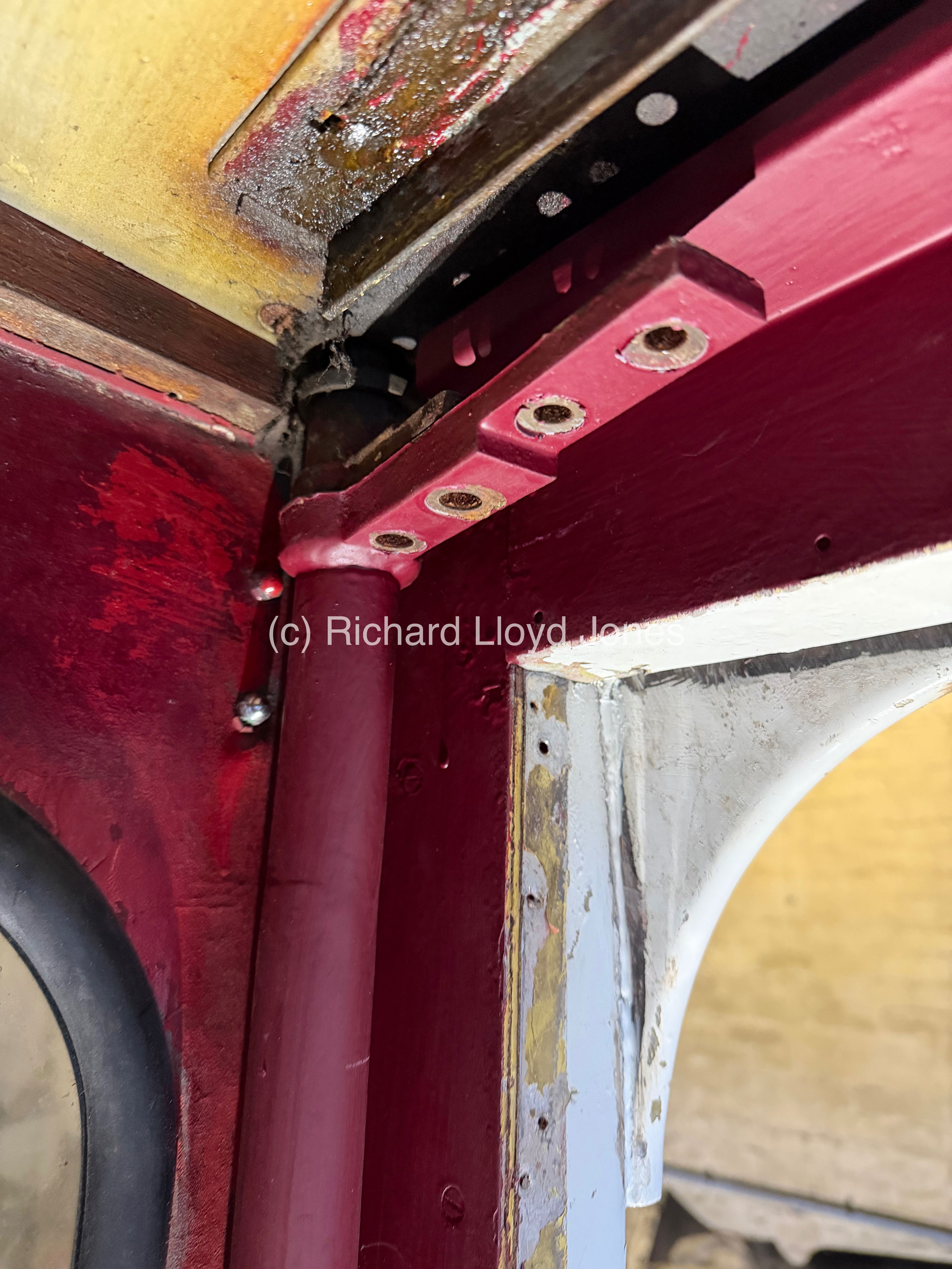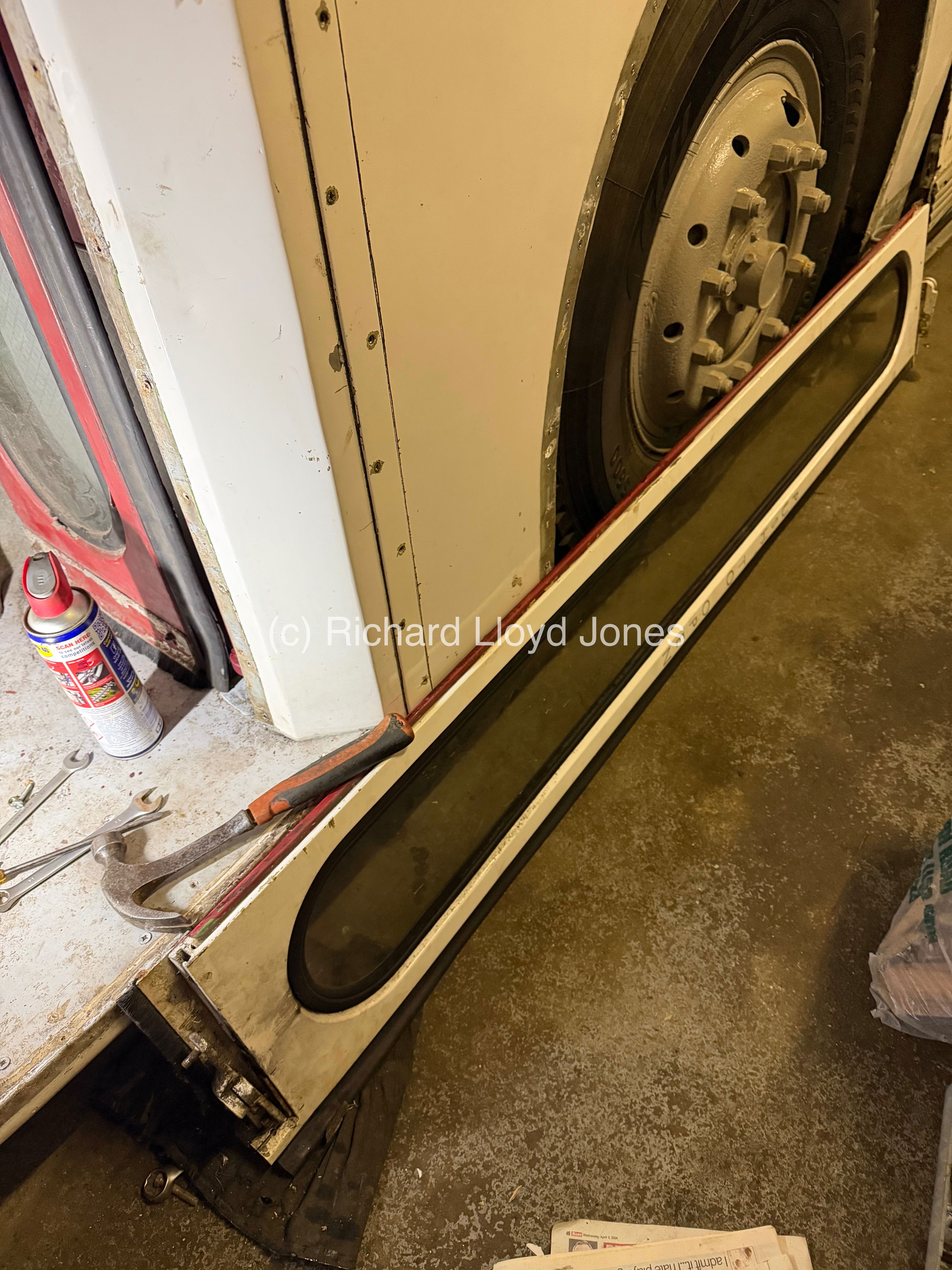 As the passenger door pole brackets and steel washers dry from treatment we turn to removing the final bright work pieces from CRG163 which sits on the offside rear emergency door.