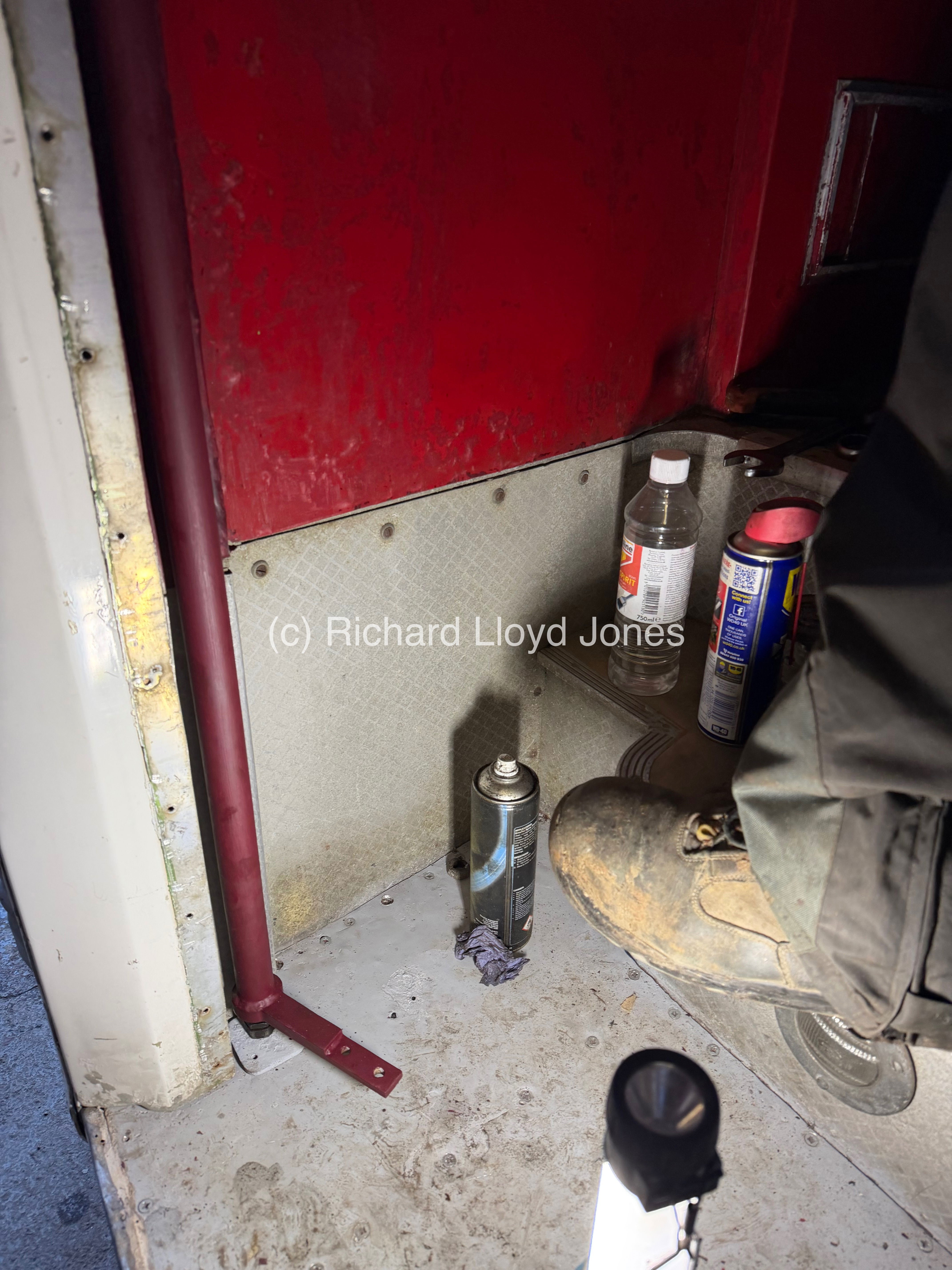 Hours are taken to remove the nuts around the large screw shaft bolt underneath one of the passenger doors. Heat is added to expand and then strike the nuts for movement. These are very important in the final housing and final vertical adjustment of the passenger entrance express door. Diolch yn fawr iawn Aled a Dewi unwaith eto am y cymorth arferol y cafwyd! / Thank you again Aled and Dewi for the valuable support as always!
